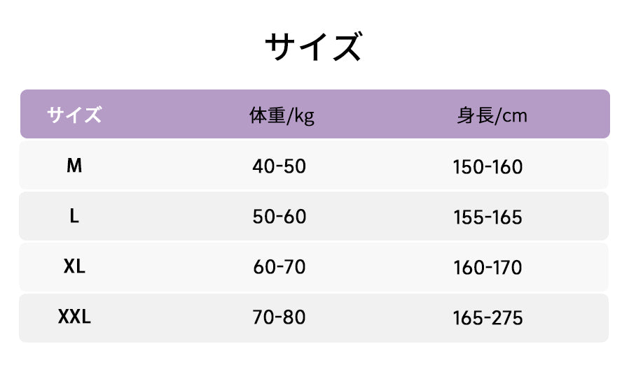 A: 商品ページにサイズ目安表がありますのでご参考ください。こちらに直接お問合わせていただいても大丈夫です。