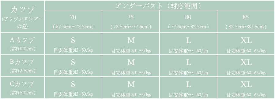 A: 商品ページにサイズ目安表がありますのでご参考ください。こちらに直接お問合わせていただいても大丈夫です。