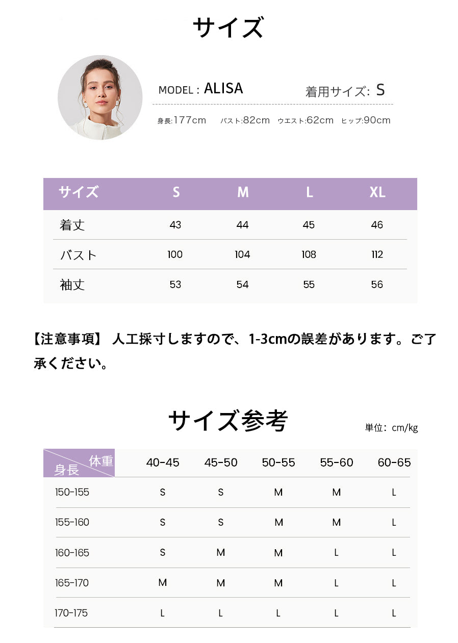 A: 商品ページにサイズ目安表がありますのでご参考ください。こちらに直接お問合わせていただいても大丈夫です。