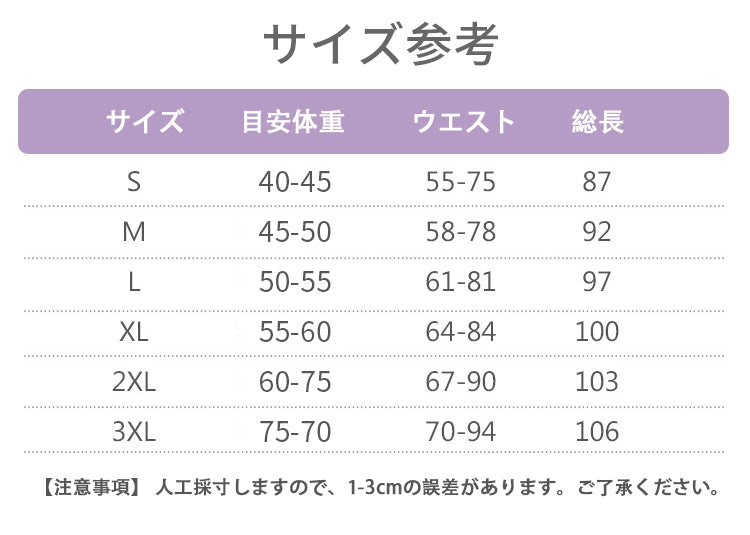 A: 商品ページにサイズ目安表がありますのでご参考ください。こちらに直接お問合わせていただいても大丈夫です。