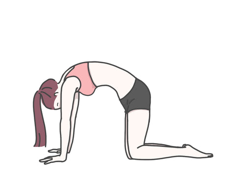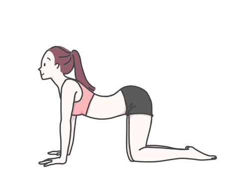 肩の下に手、腰の下に膝が来るように、四つん這いになります。ゆっくり息を吐きながら、おへそをのぞき込むように背骨を少しずつ丸めていきます。
