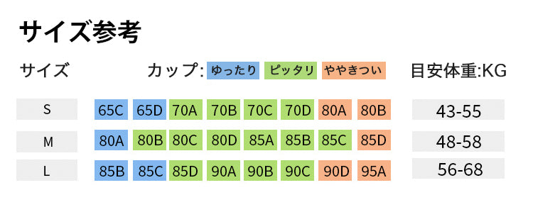 A: 商品ページにサイズ目安表がありますのでご参考ください。こちらに直接お問合わせていただいても大丈夫です。