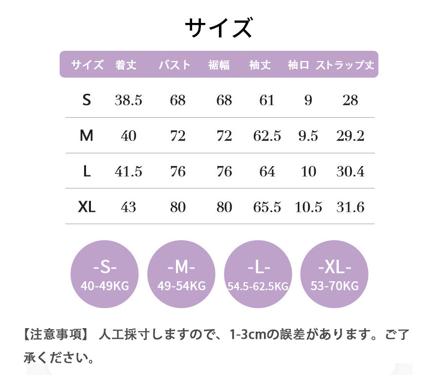 A: 商品ページにサイズ目安表がありますのでご参考ください。こちらに直接お問合わせていただいても大丈夫です。