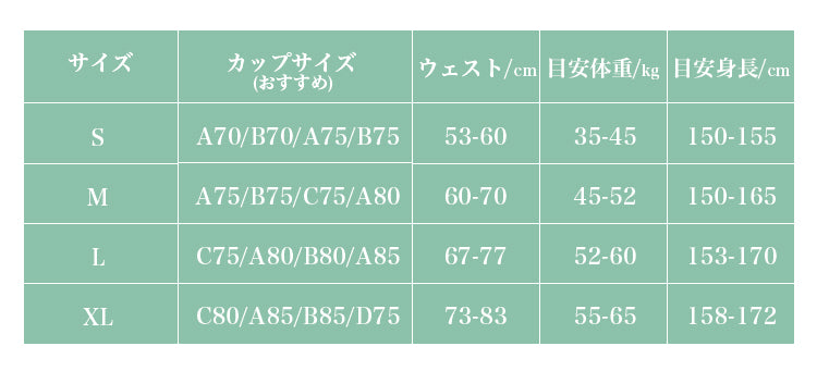 A: 商品ページにサイズ目安表がありますのでご参考ください。こちらに直接お問合わせていただいても大丈夫です。
