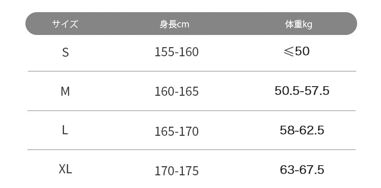 A: 商品ページにサイズ目安表がありますのでご参考ください。こちらに直接お問合わせていただいても大丈夫です。