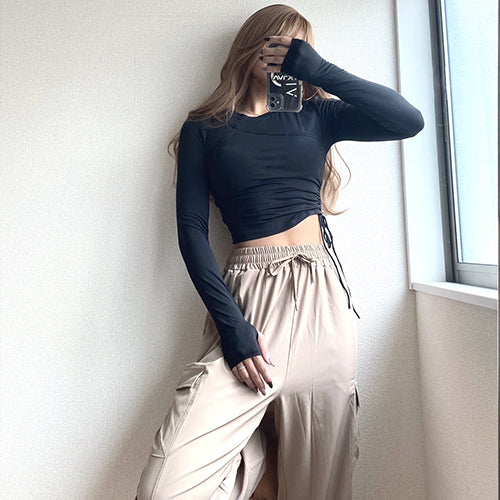 - サイドにはドローストリングをあしらい、お好みの見え感に調整だけでなく、さりげなくカジュアルな雰囲気を演出します。